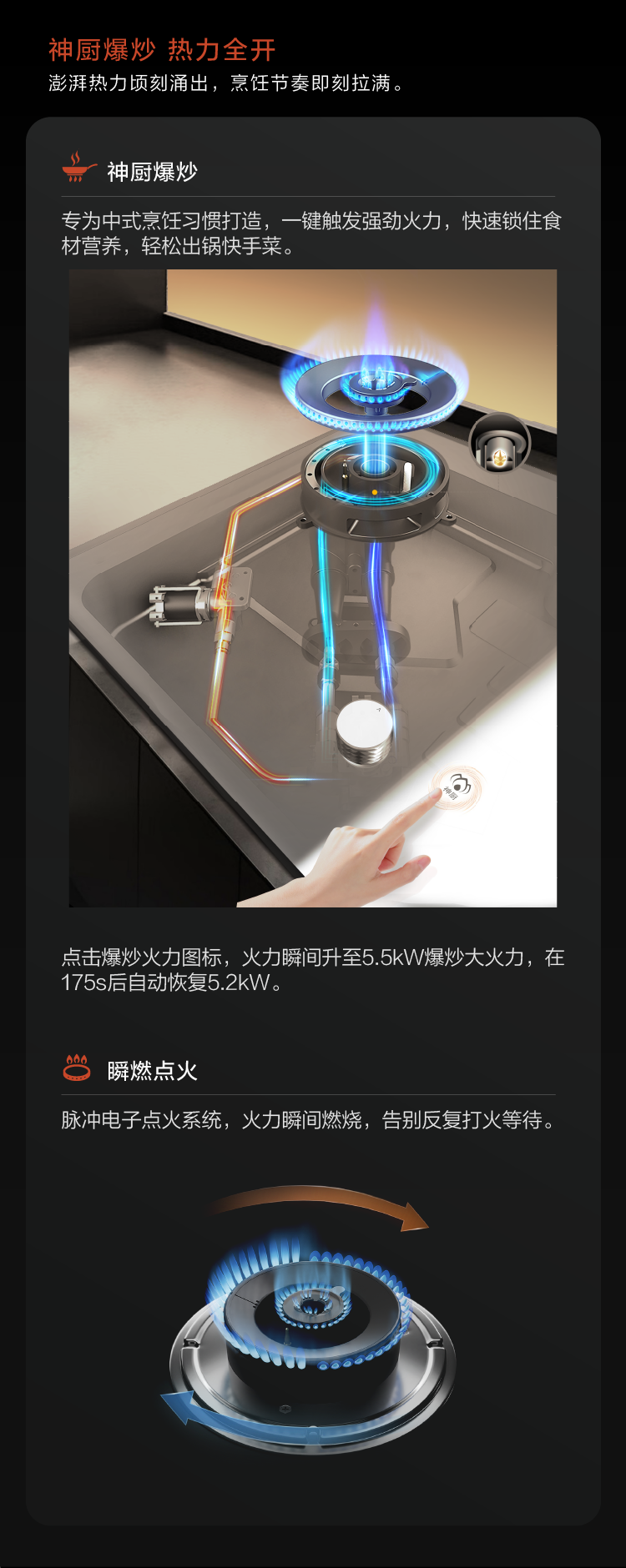 - 神廚猛火炒,最大熱負荷可達5.5KW