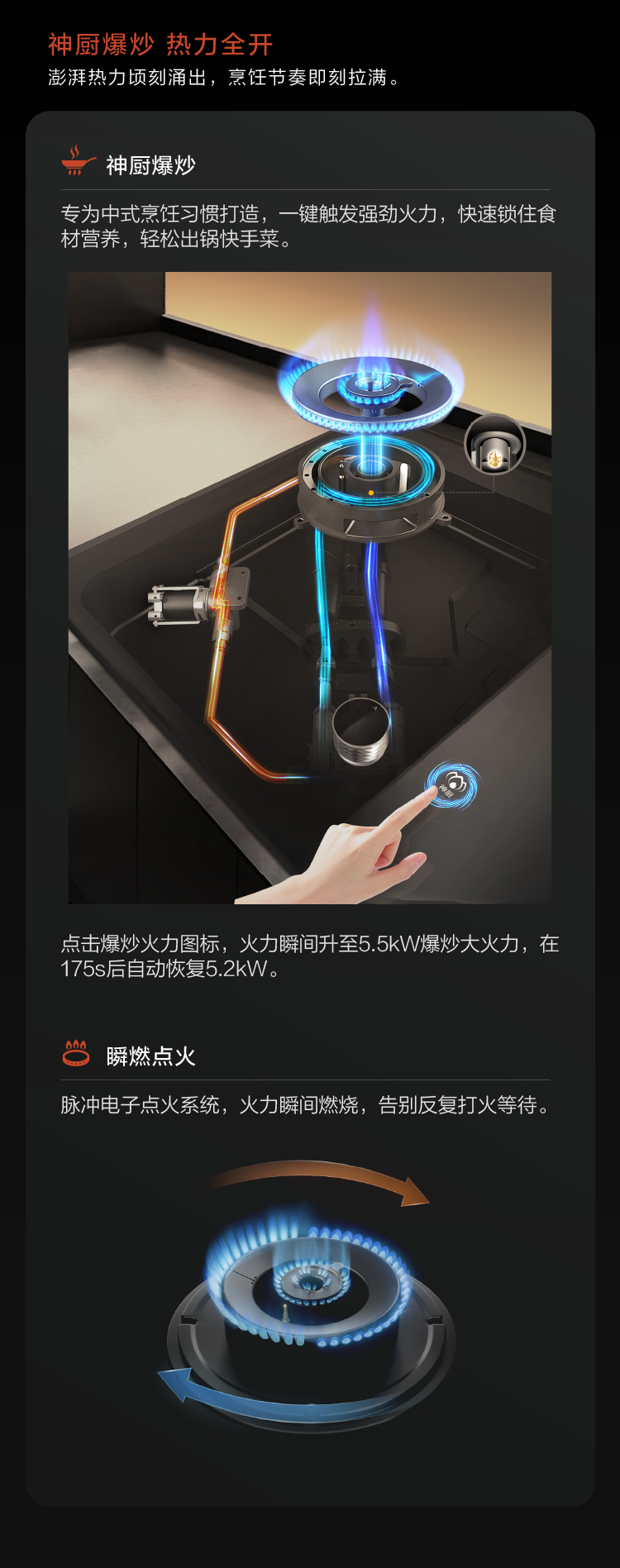 - 神廚猛火炒,最大熱負荷可達5.5KW